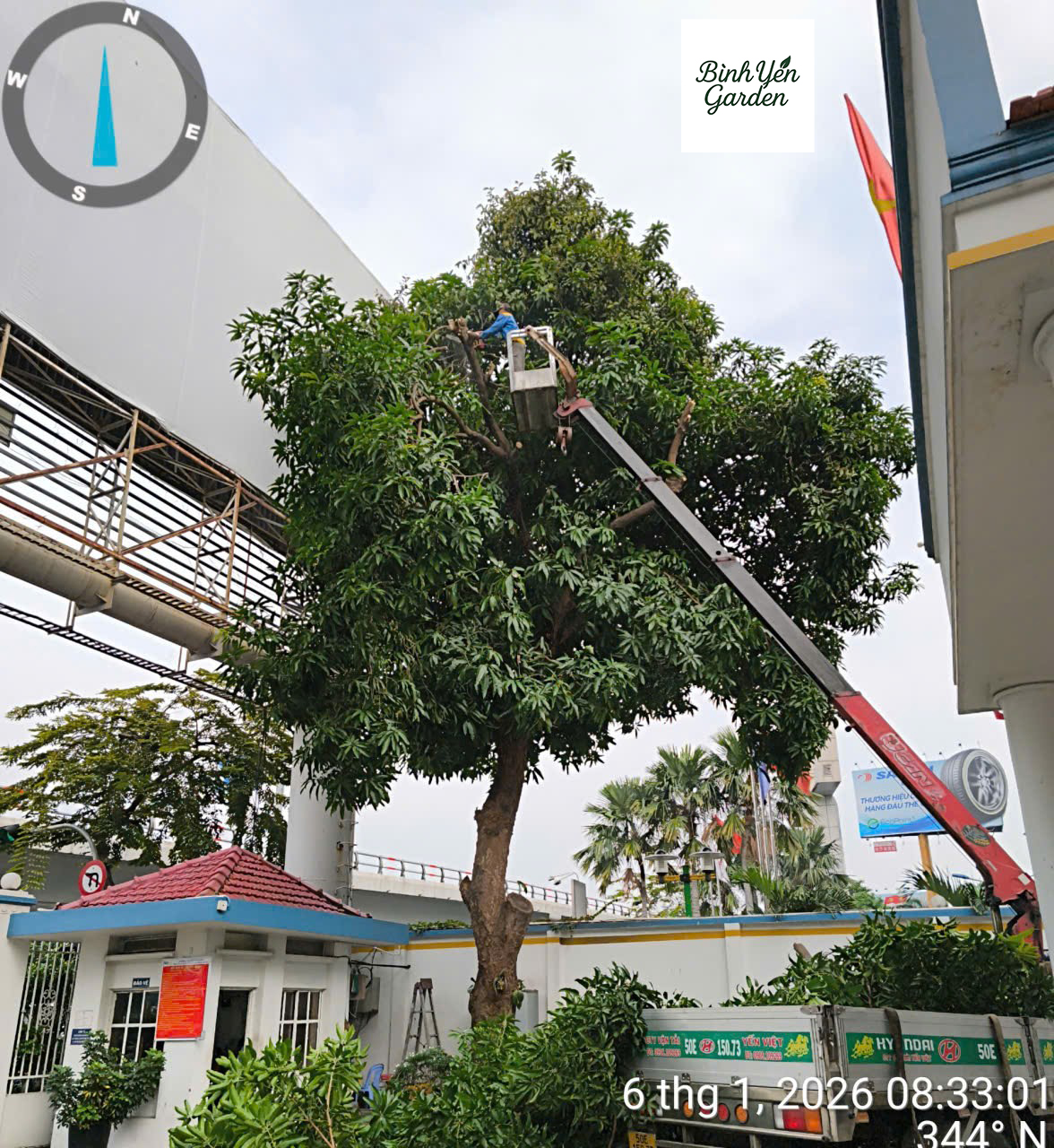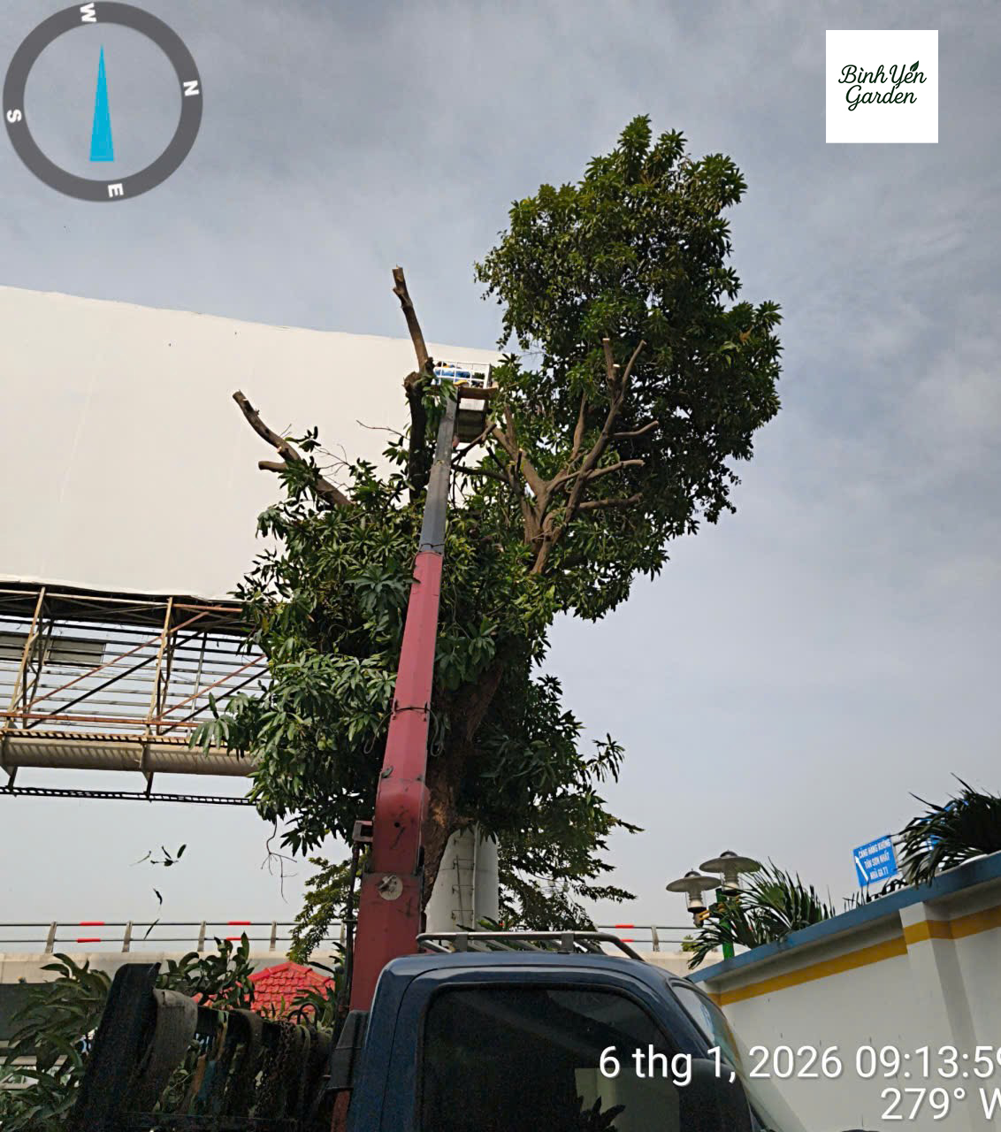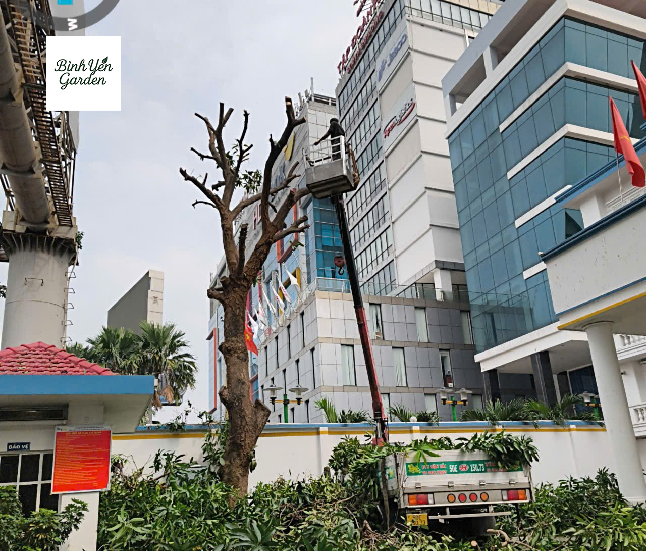 Bình Yên Garden bố trí đội ngũ kỹ thuật có kinh nghiệm cùng các thiết bị cần thiết như dây an toàn, máy cưa, xe nâng hoặc xe cẩu (nếu cần) để đảm bảo quá trình thi công diễn ra an toàn và hiệu quả.